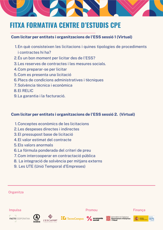 Formació virtual en licitacions adreçada a entitats i organitzacions de l’economia social i solidària. La formació consta de dues sessions de quatre hores cadascuna i està organitzada pel Centre d’Estudis per l’impuls de la contractació estratègica i responsable de Catalunya, impulsat per Facto Cooperativa, la Fundació Universitària Tecnocampus, l’Escamot cooperativa, l’associació Ariadna i la XMESS.