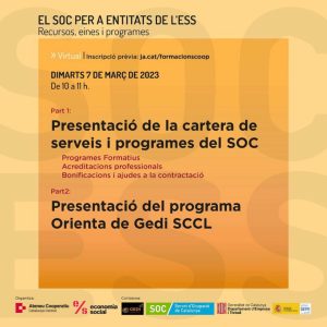 Sessió de presentació dels diferents programes del SOC que es poden acollir empreses cooperatives i entitats de l’Economia Social i presentació del programa específic de l’Orienta que gestiona Gedi i que s’ubica a la mateixa seu que l’Ateneu Cooperatiu de la Catalunya Central