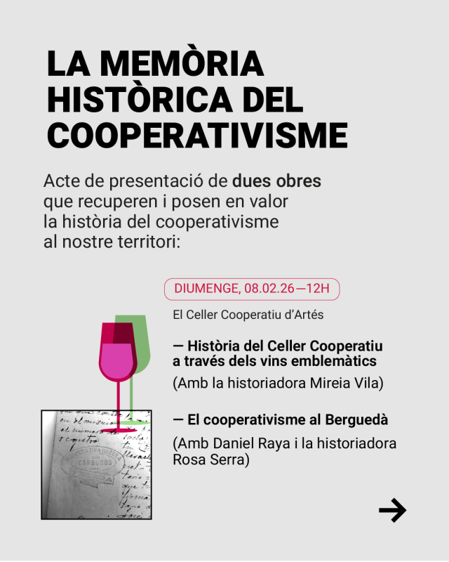Repassarem la història del celler cooperatiu a través de vins emblemàtics amb la historiadora Mireia Vila, i el cooperativisme al Berguedà amb els historiadors Daniel Raya i Rosa Serra