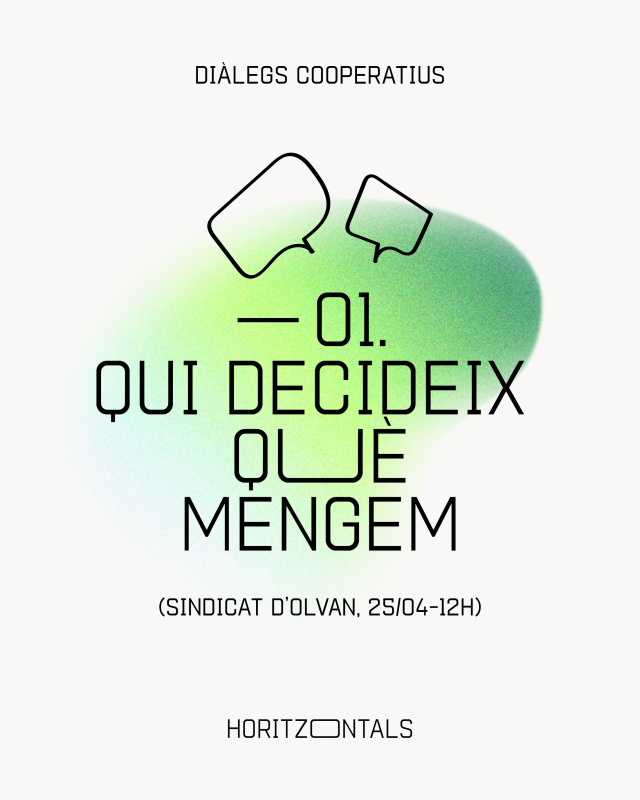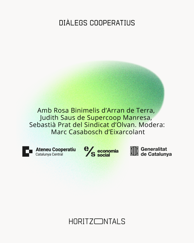 Horitzontals: diàlegs cooperatius és un cicle de pòdcasts que vol posar en conversa experiències consolidades i persones expertes de l’economia transformadora. Els següents capítols del cicle seran «Què fem per un habitatge digne» el 15 de maig a les 18 h a la Biblioteca de Solsona amb Laura Grau de moderadora, «Com posem la vida al centre» l’11 de juny a les 18 h a La Rosada de Prats de Lluçanès amb Elena Crespi moderant, «D’on ve el cooperativisme que vindrà» el 9 de juliol a les 18 h al Celler Cooperatiu d’Artés amb Anna Gabriel de moderadora i «Quins escenaris culturals volem» el 24 de setembre a les 18 h al Casal Popular Boira Baixa de Manlleu amb Rosa Cerarols moderant.