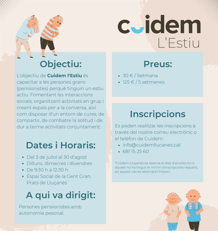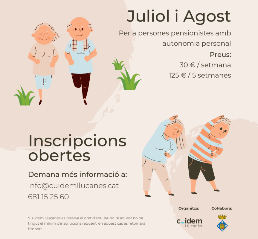 Es portarà a terme els dilluns, dimecres i divendres de juliol i agost, a l’Espai Social de la Gent Gran, i va dirigit a persones pensionistes amb autonomia personal. Compta amb la col·laboració de l’Ajuntament de Prats de Lluçanès.