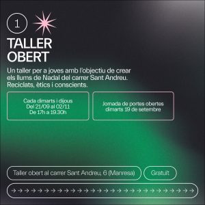 El taller impulsat per Cultura del Bé Comú estarà obert cada dimarts i dijous de 17h a 18h perquè tots els joves que tinguin interès en el projecte puguin venir a veure les instal·lacions i conèixer més a fons la proposta. Es proposa la creació d’instal·lacions lumíniques de Nadal per al carrer Sant Andreu de Manresa a través d’una intervenció col·lectiva, amb l’objectiu de fomentar l’aprenentatge bàsic de l’electrònica i la vinculació amb l’entorn social de la ciutat.