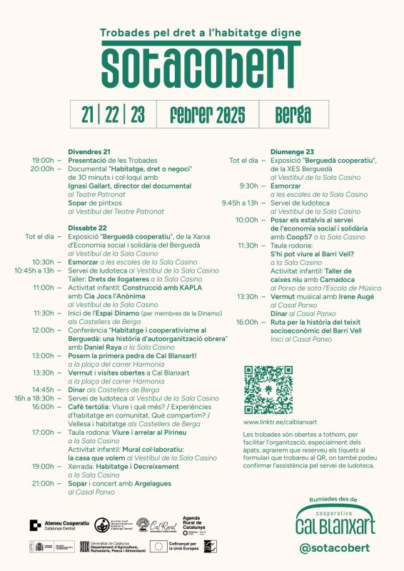 Durant els tres dies, en diversos espais del barri, es generaran moments de reflexió amb la participació de diversos actors implicats en la lluita pel dret a l’habitatge digne, per posar en valor les propostes que ja s’han fet fins ara i obrir el camp a noves propostes. Les activitats que hi haurà són taules rodones, conferències, documentals, tallers, exposicions, visites guiades, cafès-tertúlia, activitats infantils… així com àpats populars i concerts. Sota Cobert compta amb el suport d’entitats del teixit associatiu berguedà com el Casal Panxo, la companyia de jocs l’Anònima i Camadoca, entre moltes altres organitzacions i persones a títol individual que participen activament a les trobades. També compta amb el suport institucional des de l’Ateneu Cooperatiu de la Catalunya Central i Cal Rural (Associació pel Desenvolupament Rural de la Catalunya Central). Totes les entitats participants es poden consultar en el programa extens on també hi ha tots els detalls i horaris. Es disposarà de servei de ludoteca en les franges principals per tal de facilitar la participació de les persones